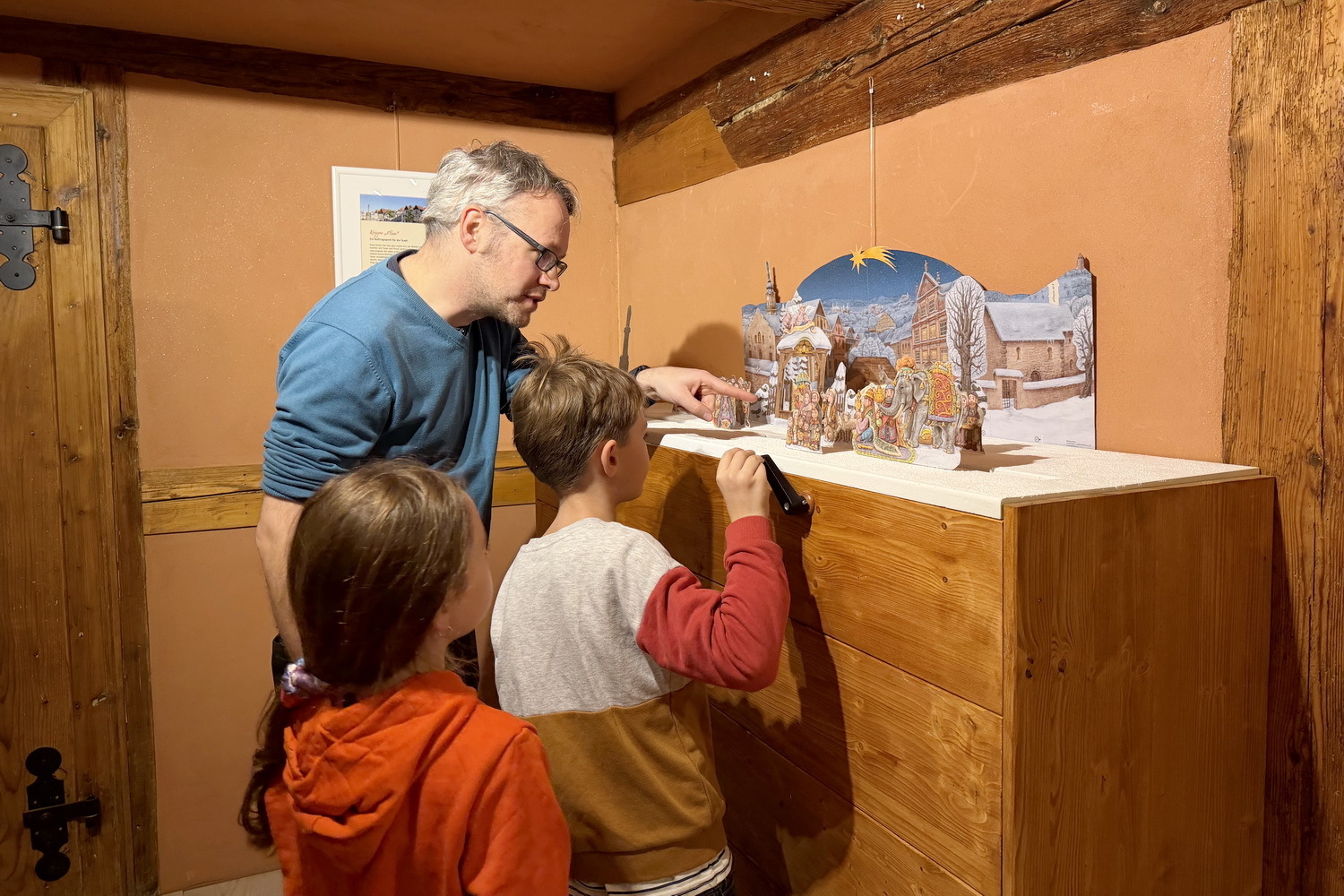 Neu waren auch zwei bewegliche Papierkrippen, die speziell für Kinder gebaut wurden. Aus Zwei mach Eins - so lautete die Devise bei der Idee der neuen Kurbel-Krippe. Wir haben dazu zwei Bastelbögen des Grafikers Kurt Völtzke aus Chemnitz kombiniert: die Weihnachtskrippe und die Waldlandschaft. Während der Stall mit der Heiligen Familie wie bei allen Weihnachtskrippen ganz starr bleibt, lassen sich die Tiere des Waldes mit einer Handkurbel in Gang setzen. Außerdem haben wir die große Papierkrippe mit der Stadtkulisse von Kremsier (Mittelböhmen) mit einer Mechanik ausgestattet, die auch von Besuchern bedient werden kann. Wir haben diese Krippe gewählt, weil sie eine Besonderheit aufweist: Sie bildet alle vier Jahreszeiten ab und spielt so auf die spirituelle Sichtweise an, dass sich das Wunder von Weihnachten jederzeit wieder ereignen kann.