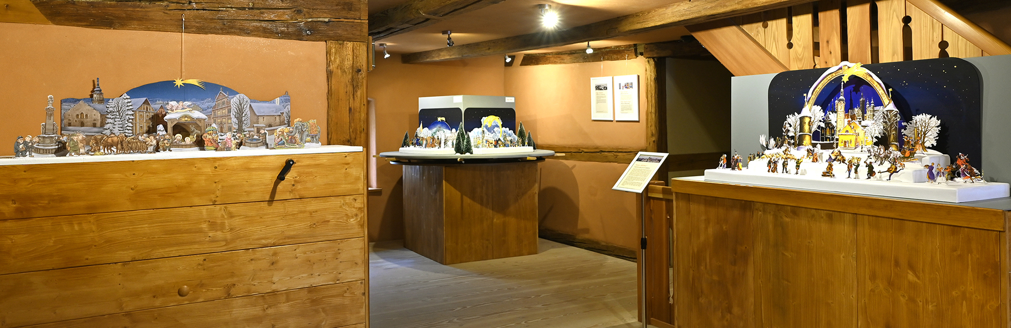 Um die verschiedenen Ausdrucksformen bei Papierkrippen zu veranschaulichen, haben wir einen kleinen Raum hergerichtet, in dem Exponate aus verschiedenen Zeitepochen die Entwicklung der Krippentradition präsentiert. Den Barock vertritt die weltbekannte Weihnachtskrippe von Telfs, die von Georg Haller (1772–1838) gemalt wurde. Den Stil der Nazarener lässt sich bei der Krippe von Josef Führich (1800-1876) finden. Wir zeigen auch die erste Papierkrippe mit regionalem Hintergrund von Mikoláš Aleš 1852-1913) und eine Faltkrippe aus geprägtem Karton (um 1930). Den Schluss der Zeitreise bildet eine moderne Krippe von Heinz Schubert (2012-2001), die in der Art von Kinderbuchillustrationen gestaltet ist.