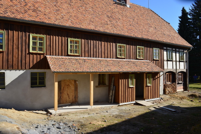 Die alte Holzkonstruktion ist bis auf wenige Reparaturstücke erhalten geblieben. Einige Fenster konnten original erhalten werden, andere wurden denkmalgerecht ersetzt. Der alte Holzaufbau und die Fachwerkwände wurden repariert und mit Lehm verputzt. Vorsichtig sind wir auch mit der weiteren Altsubstanz umgegangen. Die gemauerten Gewölberäume wurden saniert und erhielten ebenfalls Lehmputz. Die historische Dachdeckung blieb auf der Hausvorderseite unberührt. Auf der reparaturbedürftigen Rückseite wurden die alten Handstrich-Bieberschwänze abgenommen, aufgearbeitet und in Mörteldeckung neu verwendet.