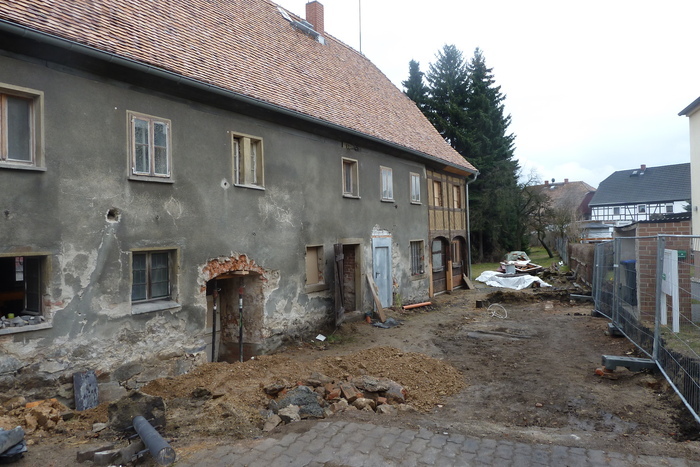 Alte Häuser sind für Überraschungen gut. Aber diese hat der Umgebinde-erfahrende Architekt Knut Wolf nicht geahnt: Als im August freiwillige Helfer den Fußboden im Gewölberaum ausschachten, stoßen sie auf ein Fundament, das nur aus einer dünnen Feldsteinschicht besteht. Notsicherung ist erforderlich – mit 20 Tonnen Kies, die umgehend verfüllt werden, und Holzstützen an den Gewölbesäulen. Allgemeines Aufatmen, Grundbruchgefahr abgewendet. Die dauerhafte Sanierung des Fundaments – die aufwendige Nachgründung – erfolgt im April 2013.