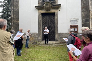 Mit dem Bus ging es von Löbau über Zittau in den kleinen Wallfahrtsort Oberpolitz, der nicht nur wegen der gestrandeten Madonna, sondern auch aufgrund des einstigen Erzdechanten Wenzel Hocke bekannt ist. Pfr. Michael Dittrich war großer Fan von dieser böhmischen Urgestalt, der im Volksmund auch "Hockewanzl" genannt wird. Denn beide verband die Liebe zum kantigen Humor, mit dem auch gern offen Kritik gegen Obrigkeiten laut wurde. In der kürzlich restaurierten Wallffahrtskirche, die von einem überdachten Kreuzgang umringt ist, feierte die kleine Gemeinschaft aus Freunden von Michael einen Gottesdienst und erinnerte sich dabei daran, was der Einzelne vom verstorbenen Gefährten empfangen hat. Weiter ging es nach Jestřebí u České Lípy, einem kleinen Ort unter der Felsenburg Habstein/Habštejn, wo das Mittagessen wartete. Letzte Station war Böhmisch Aicha/Česká Lípa mit einem Rundgang durch die Altstadt mit dem Augustinerkloster und dem historischen Markplatz. Tiefsinnige Gedichte schenkten für die Trauer um Michael Worte, die sonst schwer zu finden sind. Aber sie verwiesen auch auf Horizonte für Neues, das sich mitten im Schmerz zeigen will.